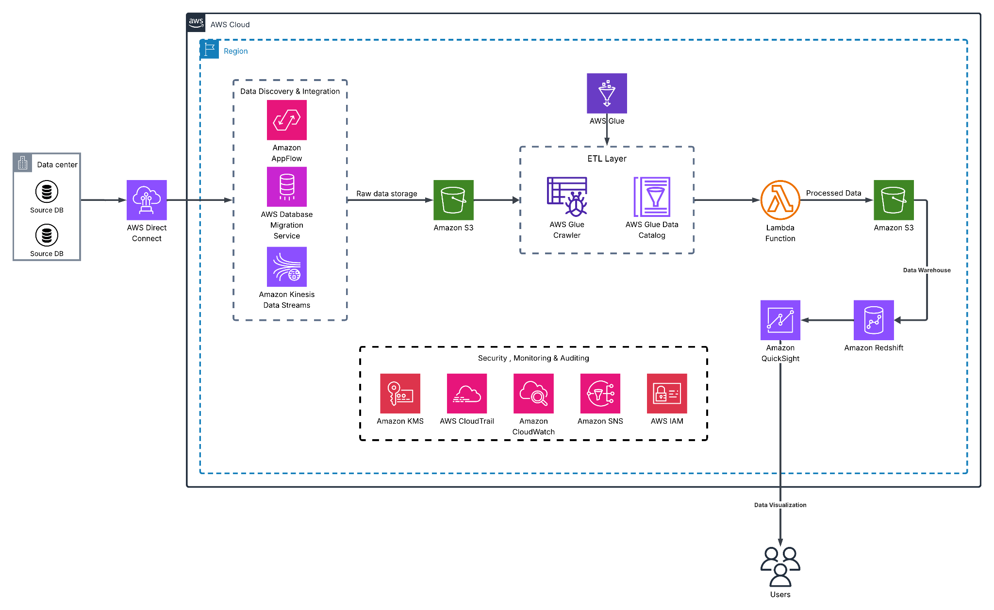 – IAM, KMS encryption, CloudTrail, CloudWatch, SNS Alerts, data lineage tracking.
